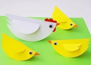 Montar um ninho de palha e colocar pintinhos e uma galinha feitos de caixa de ovo